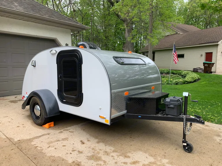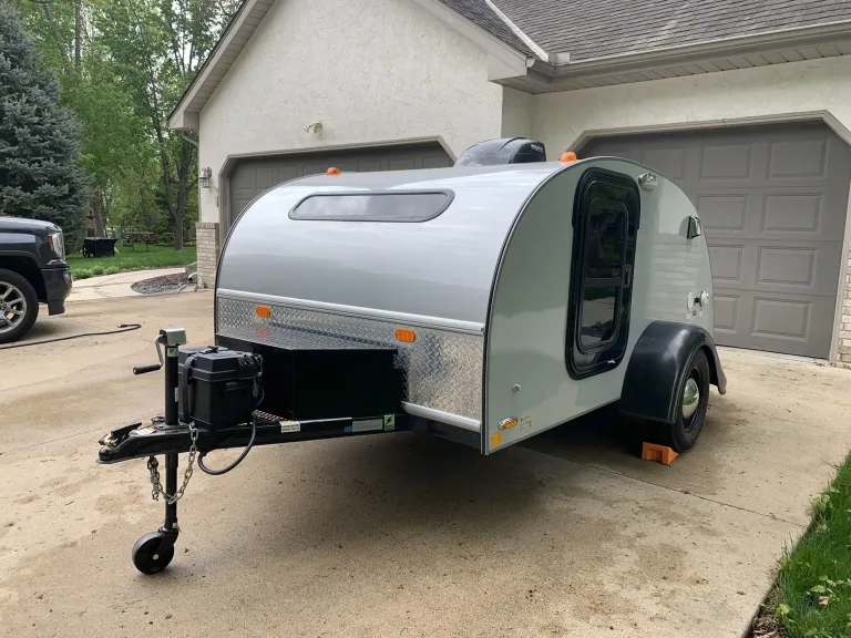 With Birch paneled interior and cabinets, 14” black steel wheels with baby moons, and fiberglass fenders, the Silver Shadow 6-Wide Max is a true “Retro-Style” teardrop with all the modern amenities you’ll want for your couples’ weekend away or wherever your wandering star takes you.Fall asleep under the stars or wake up to a beautiful morning with a Stargazer window in front – and keep comfortable with adjustable windows with screens on the doors and a Fantastic 3 speed two-way fan overhead. In warmer weather, kick on the built-in A/C and cool off the interior in just minutes.Easily sleeps two adults comfortably on the king size memory foam mattress. That’s right – most Teardrops in this class are 5’x8’ – this Silver Shadow 6-wide Max is 6’x10’ and offers an 80” x 70” king size mattress. On those rainy days’, you’ll have enough room to stretch out and read a book or sit back and watch a movie on the built-in entertainment system.Mealtimes are made easy when you lift the back hatch to the galley. Accompanied with all the amenities you’ll want and need – plenty of storage while at camp to organize your meal-prep the way you want. Get creative with the supplied dual-fuel cooktop and grill and store your food in the 12V/110 refrigerator. Add in the luxury of a built-in sink & faucet with a five-gallon freshwater tank plus a holding tank for grey water. Pull out the storage bin and you'll find all the cooking pots, pans, cutlery, kitchen linens and dinnerware you'll need. We’ve even included marshmallow roasting forks and Pudgie-Pie Irons for over the fire!There is room for firewood or an extra cooler on the tongue and camp set-up could not be easier with the integrated leveling jacks. The best part of this teardrop trailer is you can literally set up camp in about five minute and then sit back, relax and let the world melt away.Just bring your clothes because nearly everything else you’ll need is provided.What's includedIncluded in the interior: