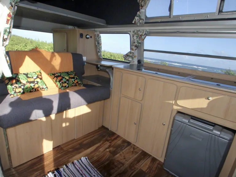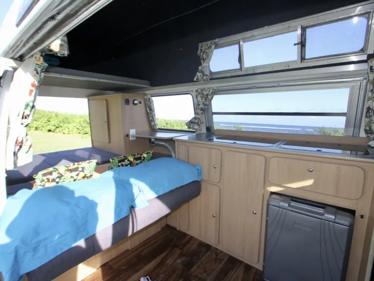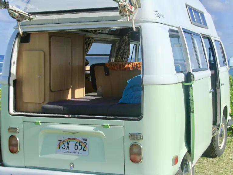 1971 Volkswagen Bus, Coco is a bubble top, or high top. Features a 3 person set in front, and can sleep up to 3. More comfortable for a couple. She does have an electric cooler and is definitely a nice drive. Additionally she also has a safe box and speakers on the back to make a nice chill surrounding.
