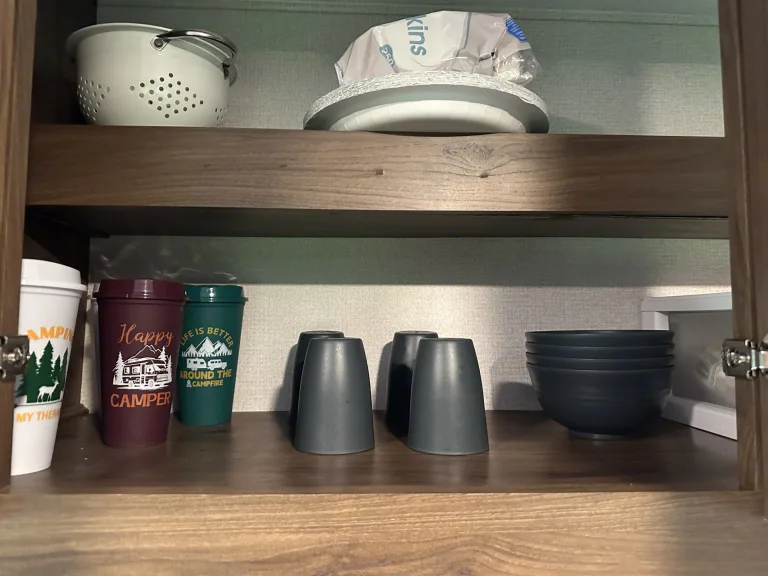 •kitchen utensils, 8 large non-breakable dinner plates, 4 smaller non-breakable dinner plates, 4 plastics to go coffee cups with lids, 4 cups, 4 bowls, silverware