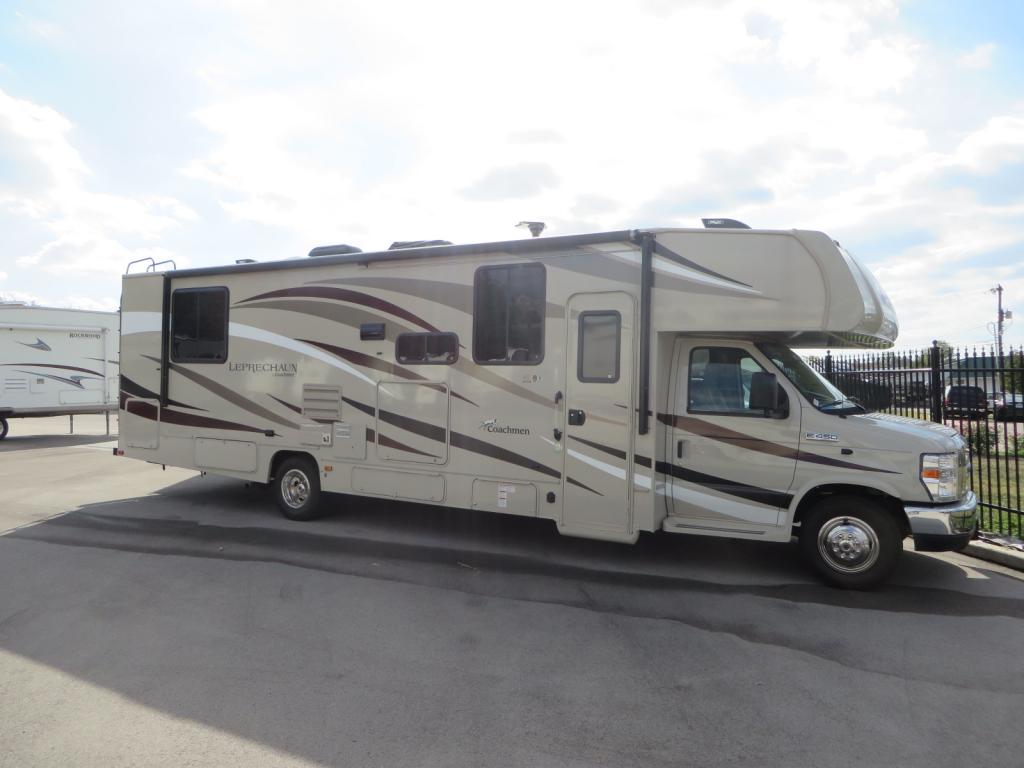 This Coachmen Leprechaun class C gas coach is ready for any road trip you take! Model 319MB offers an outdoor camp kitchen along with an outdoor tv/stereo/dvd player, a u-shaped dinette, double slides for added interior space, a rear bedroom, and spacious living area thanks to the wide width and large slide out. Along with a huge power awning!Step inside behind the front passenger seat and notice the overhead sleeping space above the cab area to your right. You also have the optional passenger and driver swivel seat .Straight in the entry door find a sofa and u-shaped dinette slide out including cabinets for storage above the sofa. To the left of the entry door there is a power lift TV to enjoy from any seating space in the room.The kitchen offers everything needed to create light meals and snacks as you travel. There is a double sink for cleaning up, a three burner range, an overhead microwave oven, plus refrigerator. There are also overhead cabinets above the counter for storing your dishes and other kitchen items as well.Head towards the rear of the coach and walk through the complete bath including a 32" shower on your left side, and a toilet with vanity and sink including a medicine cabinet on your right.The master bedroom features a serta memory foam queen bed along the rear wall, bedside wardrobes, plus a nightstand on the left side, and a slide out wardrobe along the road side for all of your hanging clothes. There is also a 32” wall mounted tv with DVD player.You are sure to enjoy the outdoor camp kitchen with a sink and refrigerator. There’s an outdoor shower plus so much more! My favorite feature is the Bigfoot auto leveling system. No more cranking! You will love our “little leprechaun”!