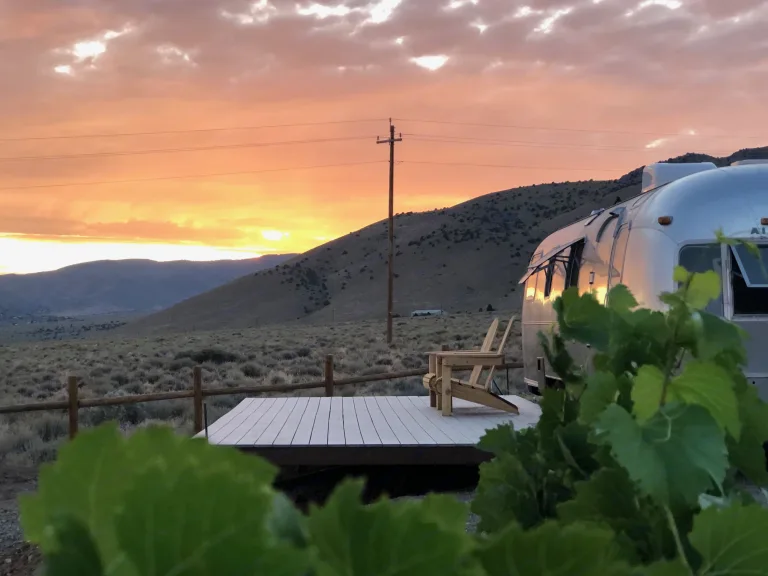 Beautifully restored, luxury Airstream Land Yacht, "Sunset Chateau" is your ultimate vineyard hideaway. No towing! Just come stay in our Vineyard! Situated in a private corner of our 39 acre property, with mountain and vineyard views from your private deck. Enjoy starry nights, beautiful sunsets and all that nature has to offer including hiking, fishing, kayaking in nearby Lake Topaz (7 mi) or beautiful Lake Tahoe. (45 mi.) The Interior features new Queen bed with super comfy mattress and linens, stainless bath, all new dinette seating, new refrigerator, microwave, coffee maker & more. A unique Vineyard Vacation Experience!