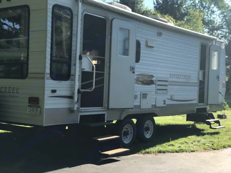 2007 Sunset Creek Travel Trailer. Approximately 28 feet in length. Sleep 6 comfortably. The trailer has a camper queen size bed with a memory foam topper, a twin fold down couch, and the dining room can be turned into a sleeping area. There is an indoor kitchen with a microwave, oven and refrigerator. Also, two swivel chairs are provided for relaxation. The trailer does have A/C and Heat.