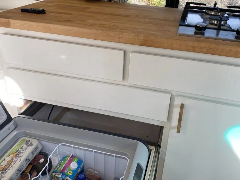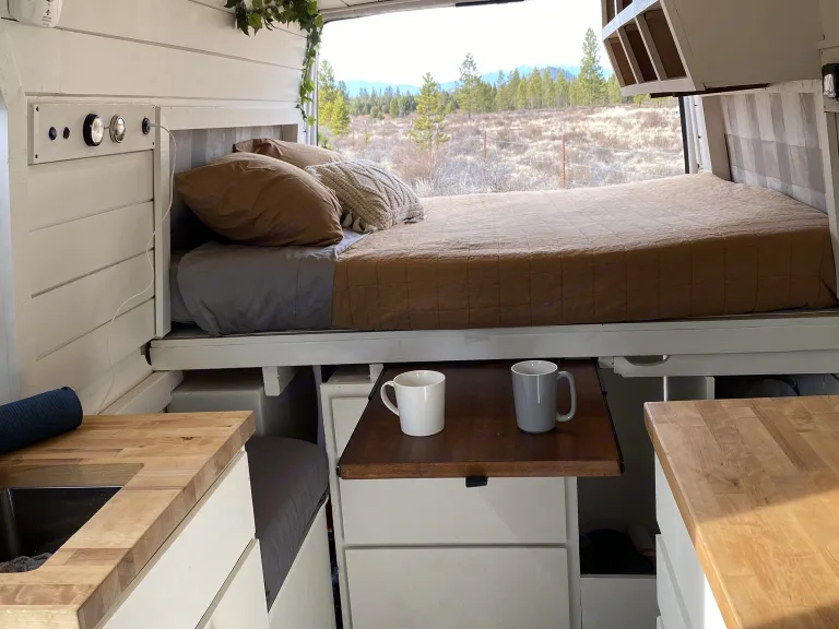 Designed with luxuries for for off grid camping. This van is equipped the conveniences needed for a great experience, including a large queen-size bed, refrigerator, diesel heater, propane-powered gas stove and outside hot shower, 25-gallon freshwater tank supplying running water sink with a 10-gallon grey water tank. Comfortable table for two and swivel passenger seat. The van has two 100 amp lithium batteries charged with two 150-watt solar panels and are charged while the van is running, so you have ample power for all needs. A digital battery indicator lets you know how much power you have. Lots of inside storage and a rear garage. What's includedFresh linens.