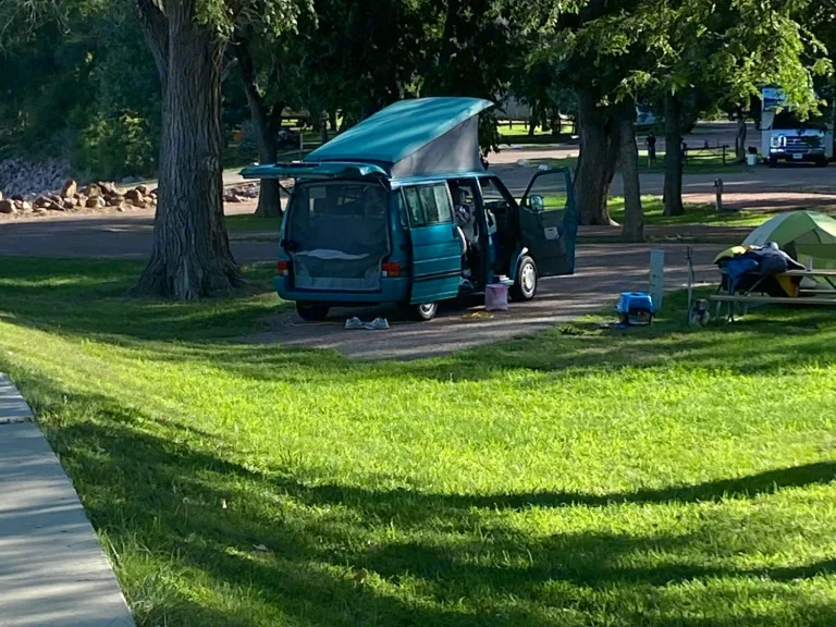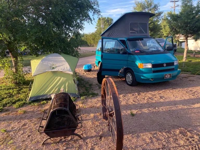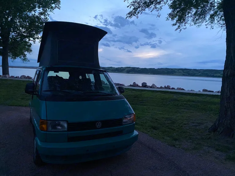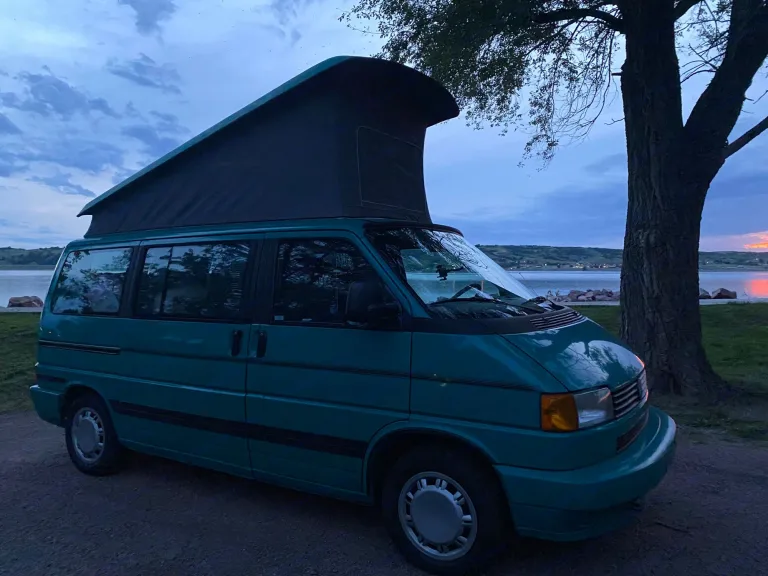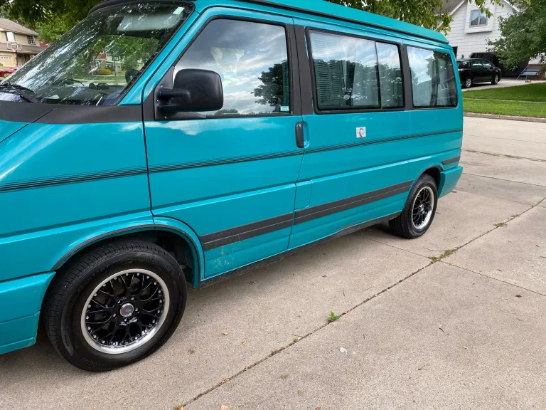 Teal Volkswagen Transporter (T4) MV Eurovan Westfalia Weekender Edition. Produced in 1993 but lots of modern upgrades! Sleeps 4 adults or 2 adults and 3 kids. Could maybe squeeze an extra kiddo in front if you have a front-seat mattress or we can provide you with a tent!Vanogi is a 1993 van so we need her to stay a little closer to home. We do complete a thorough inspection and cleaning before each trip plus regular maintenance to ensure she is safe and reliable; however if a breakdown were to occur (unlikely) we can quickly attend to you and this classic Westfalia if she's nearby.Vanogi is not made for mountain life, off-roading, trekking or crazy wild parties. She struggles on mountains and even small hills. She's best used as a weekend camper with a small family or friends. She can pack in a lot of gear. That said, Westies are made to drive slow and speed up slow.Iowa is a beautiful state with lots to explore, why not take her to a local campground? There are also many local wineries, farms, and biking trails with spots to camp, fish, or play sports. We've installed an 1500 watt inverter to charge the house battery while you drive and shore power plugin when you stop.- Fuel Efficient (-20+ mpg) requires premium gas