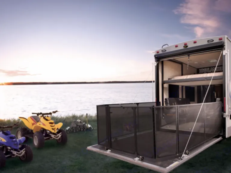 Electric Awning with LED lighting and sun shade over rear patio area. Tv in both rear sleeping/sitting area as well as in main living area. Outdoor speakers, bbq and Spray Shower.This Toy Hauler is heavy and needs to be towed with a 3/4 ton truck. Equalizer hitch included in rental.Grey and blackwater tanks must be emptied before return.