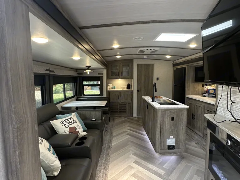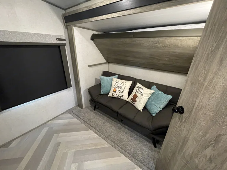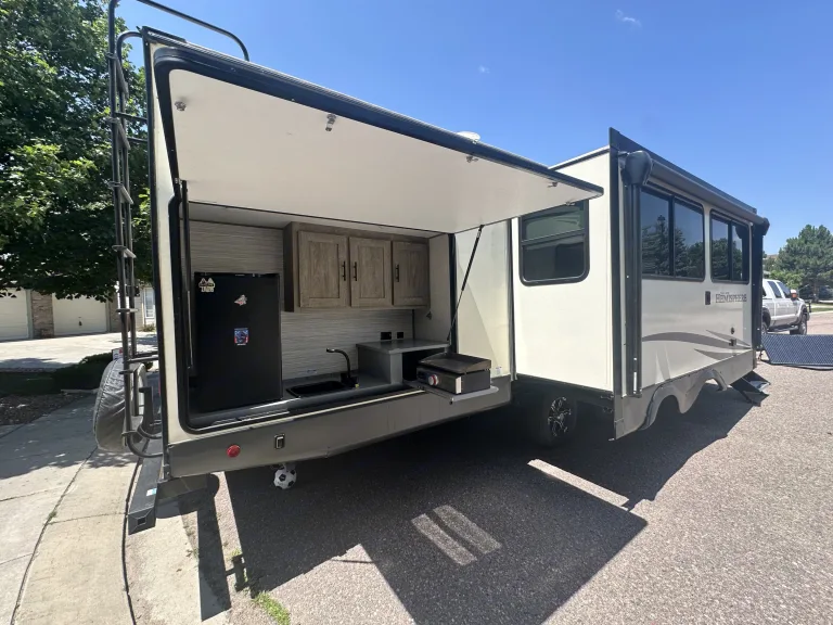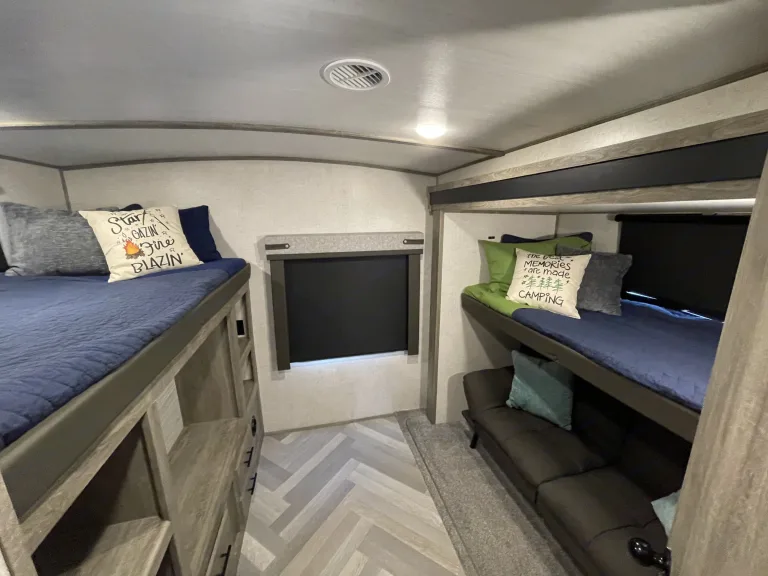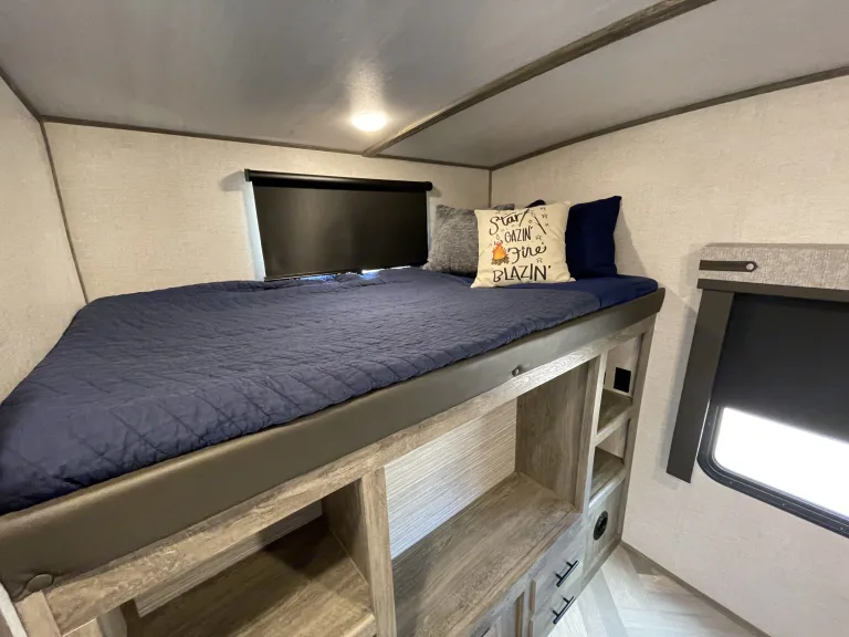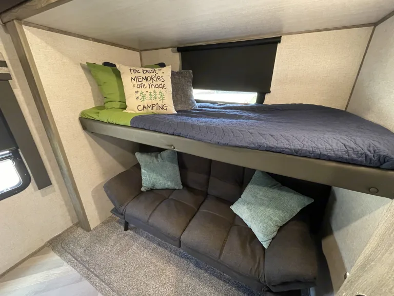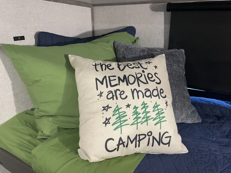 Ready for a hassle-free camping experience? Enjoy all the comforts of home while camping in this spacious travel trailer that comfortably accommodates 6 guests. With delivery and set-up, we will have everything ready to go for you--all beds made, additional bedding provided and the inside set up. All you need to do is arrive at your campsite and enjoy this residentially set up "gem" of an RV!Amenities include: cotton bedding, towels, blankets, basic toiletries (& hairdryer, ladies!), fully stocked kitchen and Plenty of space for your family to spread out! Most trailers have you crammed in like sardines, but this model allows everyone to have some breathing room—separate main bedroom with plush queen bed, spacious bunkhouse for the kids with 2 twin bunks and a twin memory foam fold-out couch (a custom upgrade), plus the dinette allowing you to comfortably sleep 6 adult guests—even more with young children. You will also enjoy the large bathroom with a spacious walk-in shower. The main living space has a slide on each side creating a large common area for cooking, eating and relaxing in the recliners while watching your favorite movie on the 50” TV. The spacious indoor kitchen boasts a walk-in pantry and large fridge. Summer days may get hot but this RV is well insulated and boasts 2 AC’s. Have a dance party inside or around the fire pit—the indoor/outdoor speakers will have you jammin’ while utilizing the outdoor kitchen, grilling, roasting marshmallows, and relaxing under the stars!Guest Comments:
