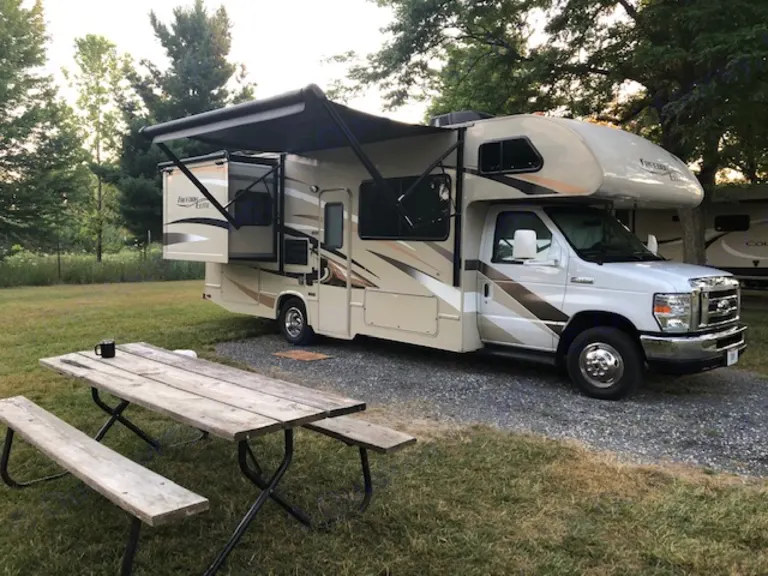 Freedom is easy to drive and not too big, not to small, just right. It has a perfect floor plan with a couch, dinette and separate shower in the bath. With the couch, dinette, loft bunk over the cab and the almost queen size bed,(with the slide-out) there are many sleeping options for a maximum of 5 people. There is a oven, (who wants to bake?) 3 burner stove and a refrigerator, freezer and microwave. Freedom has a nice separate shower and private bath for privacy. There is a flat screen TV over the cab. There is a 4000 watt Onan generator available if you need it. We've stocked it with a coffee maker, toaster, can opener, plates and silverware. All you need is food and bedding. In the basement (outside storage) there are 5 folding chairs and a gas bar-b-que grill. We will provide a bike rack on the back if you want it. The RV has a back-up camera and speed control and you sit up high, so it is easy to drive. Also, there is an Atlas supplied, if you get lost. ;)What's includedFreedom has a slide-out for the queen-size bed. There is an electric awning with lights. We have a complete 5 page operational manual for you. Please contact me so I can get your email to send it to you Please note the mileage is 100 per night.RecommendationsWe have stayed in a variety of campgrounds in Indiana and Ohio. We prefer having electric, water and sewer at our camp site. We request that your trip be limited to Ohio or adjoining states.Other things to noteWe have a minimum of 3 night and try to keep the rentals to no more than about 1 week. Please contact me for the 5 page operating manual. When you come to pick up the RV we will spend about an hour going over all of the important details and take a test drive. You can leave your vehical here if you want.