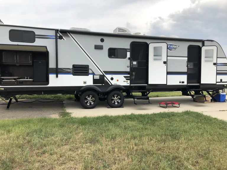 This 2018 Jayco White Hawk 31Bunkhouse has power jacks all the way around, full outdoor kitchen with cook top and place to set up the onboard grill which plugs into the onboard propane via two quick connects located at the rear of the rig. This Jayco also sports two entries, one to the master bed room and one to the main living area. In the main living area enjoy the 40” Tv, fireplace, and separate bunk house for guest or the kids. This rig gains all of that space with two slide outs one for the main living area and one for the bunk house. You will also find that this Jayco has two couches, one located in the main area and one in the bunk house. Both fold out to a surprisingly comfortable queen bed. No need to look for a bike rack one is included with your booking that attaches to the front of the trailer with ease. Looking to take this wide open floor plan for a longer trip than a weekend, have 0 worries about where you will put all your extras. This Jayco has plenty of storage and will make packing a breeze. For your convince Jayco includes a 3 x 6 table you can use for food prepping while grilling or eating at if the site doesn’t include a picnic table. So start your trip right with this beautiful spacious Travel Trailer!RecommendationsBring your own linens for they will not be provided.Other things to noteThere is no external power source, so if dry camping you will need a 3500 to 4000+ watt generator to run refrigerator, microwave, lights, and A/C there will be a $500 charge for not emptying the black tank and leaving the inside of the trailer dirty!