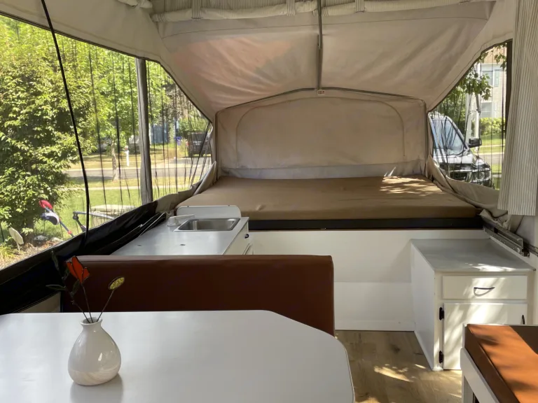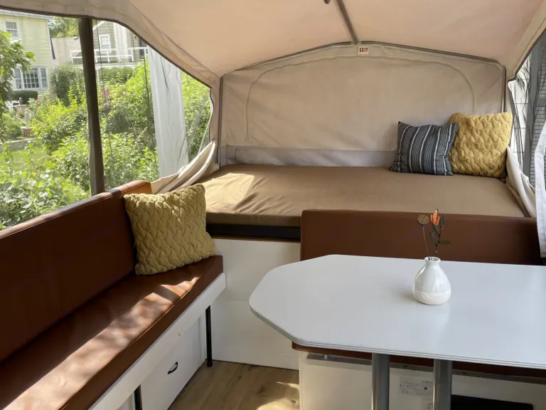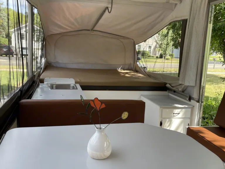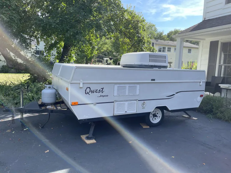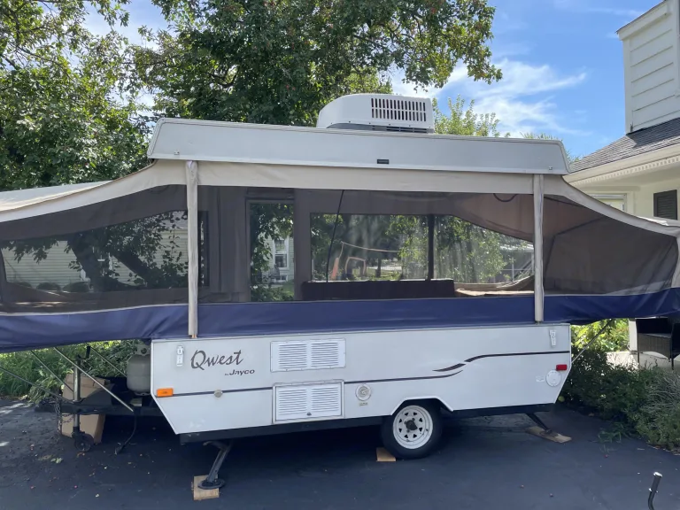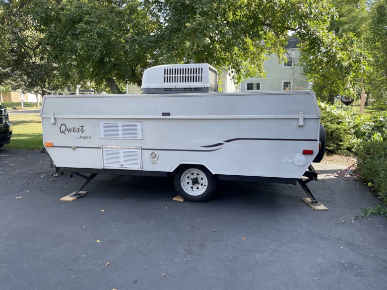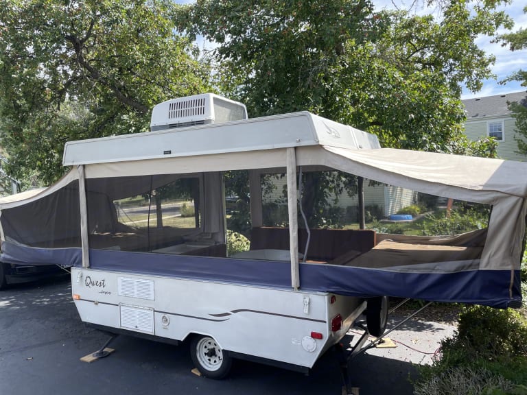 Recently renovated Jayco Qwest Pop Up Camper! A great way to camp and feel a little bit of indoor comfort!Camper has AC, heat, 3-way fridge, cooktop (to use outside the camper only), awning. Sleeps 6 adults - two beds and the table top and side bench lay flat for more sleeping space.Brand NEW - flooring, faux leather cushions, curtains, cabinet paint, black hardware.We will provide sheets for the two beds, but please bring your own sleeping bags and pillows if you want them.We will provide instructions on how to hook up and unhook to the hitch, pop up the camper, take down the camper. We will be happy to show upon pickup as well!Please no pets or smoking inside the camper.You need a 2 inch ball on the hitch and a 7 pin electric hookup for the brakes (we also have a 4 pin converter if you have that).Please message us with any questions! What's includedFresh sheets for two beds.Camping gear not included! RecommendationsWe recommend picking up a little early so we can show you how to pop up the camper and take it down! Other things to notePlease no pets or smoking in the camper!Also, if you use a camping stove, please set it up outside the camper instead of inside! Thank you!
