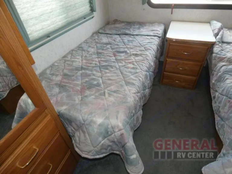 Bed sheets, pillows, and pillowcases for two twin beds in back room and queen bed over the cab.