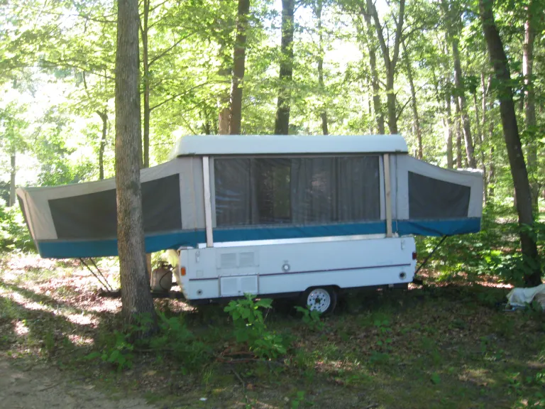 Coleman pop-up with king, queen and twin size beds, fridge, stove, sink, takes a 2 inch ball, weighs 1500 pounds
