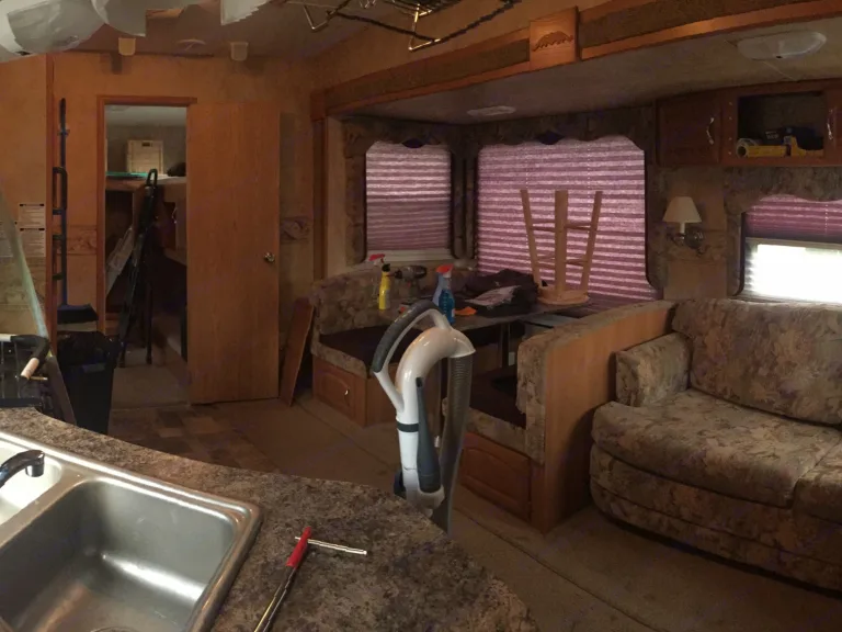 A 35 foot fifth wheel that is designed for families, with a queen bed in the front and two sets of bunk beds in a separate room at the back. There is a large pull out in the main area with a dinette and couch which can both be transitioned into beds.