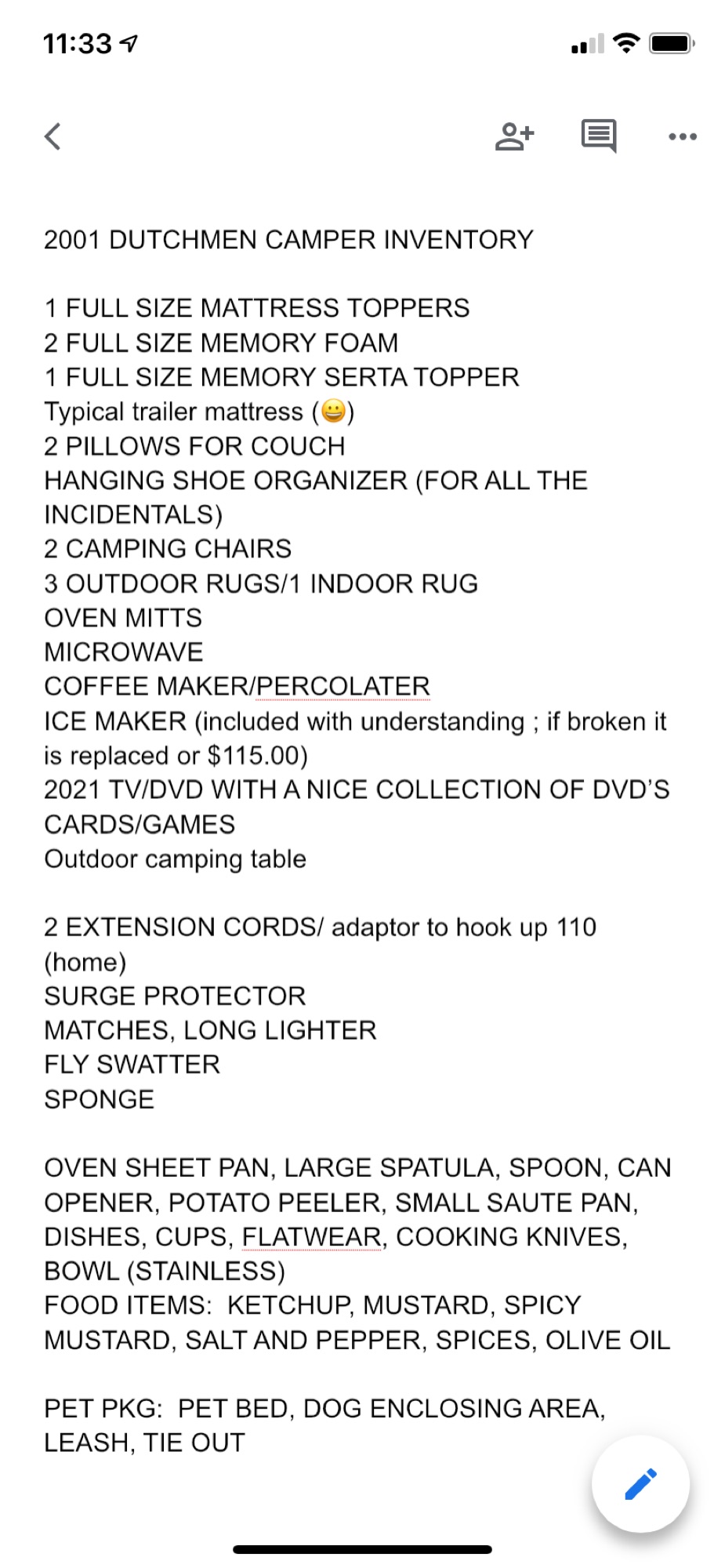 1- pet package optionalI look forward to working with you to have a wonderful camping experience.Games/cards/ dice/ Misc for kids.What's includedCamping chairs-basic kitchen supplies. Camper lights.Basic dishes/cooking. Tv/DVD (includes DVD’s) radio/cassette outdoor rugs Mattress toppers/mattress pads for beds.
