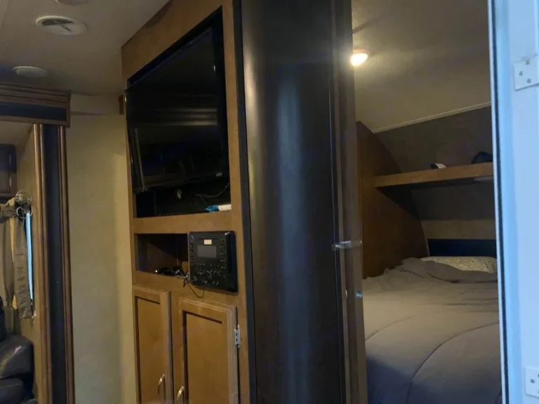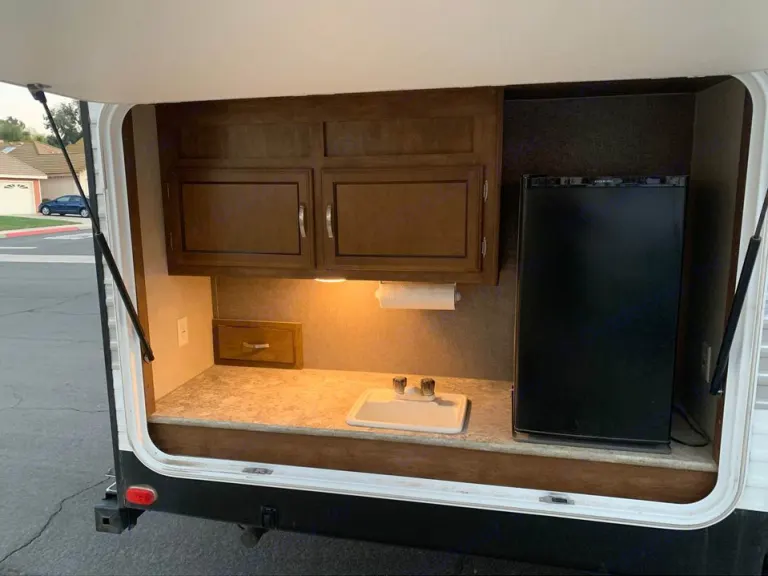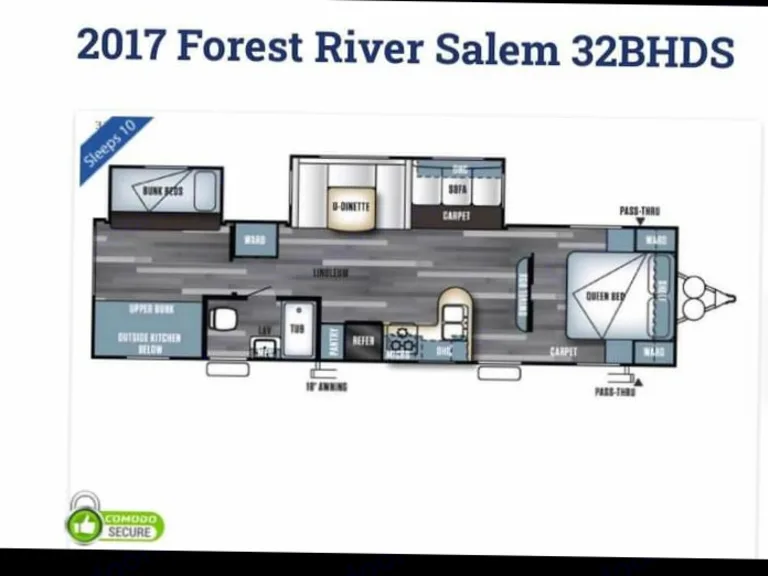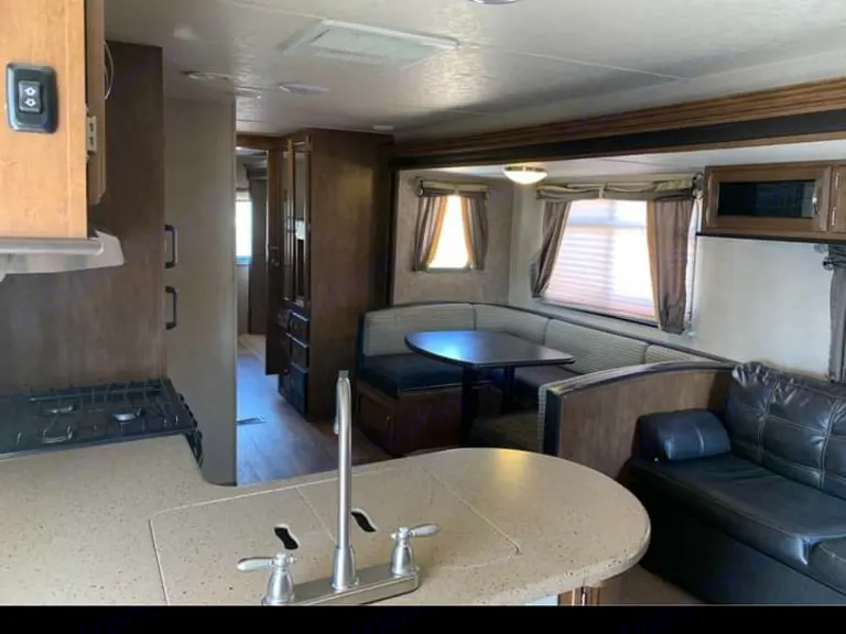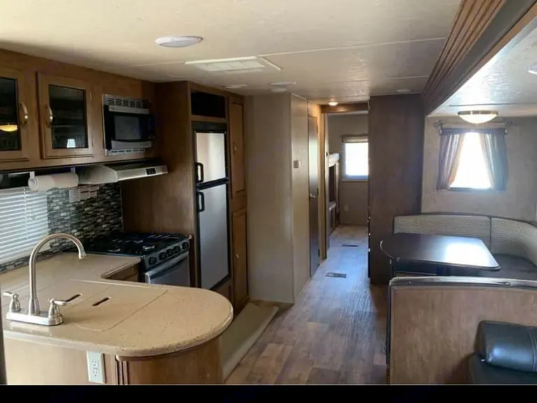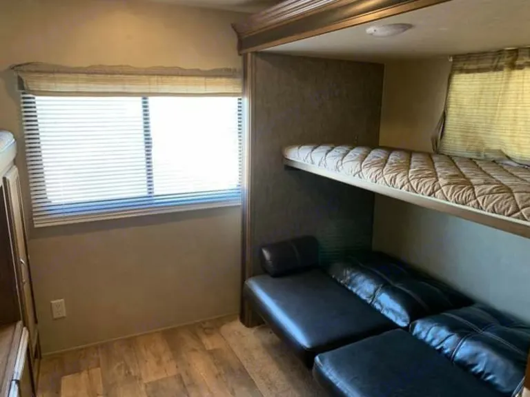 This trailer is great for family camping trips! There is plenty of room for everyone. Sleeps 10. There is a back bedroom for the kids with a set of bunkbeds and a single bed. Front bedroom for parents with a queen size bed. The bathroom has a bathtub plus a shower. Also has an outdoor shower. Spacious kitchen with plenty of storage! Plus an outdoor kitchen! Pots and pans, cooking utensils and bedding included! Queen bed, sofa folds to a bed, table folds to a bed and the in the back is a set of bunk beds plus a twin bed. Plenty of room!What's includedPots and pans, cooking utensils and bedding included! Fresh linens!Other things to noteDelivery only! We do not rent out for you to haul!
