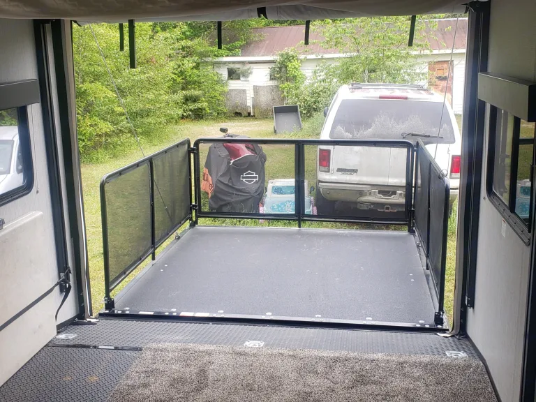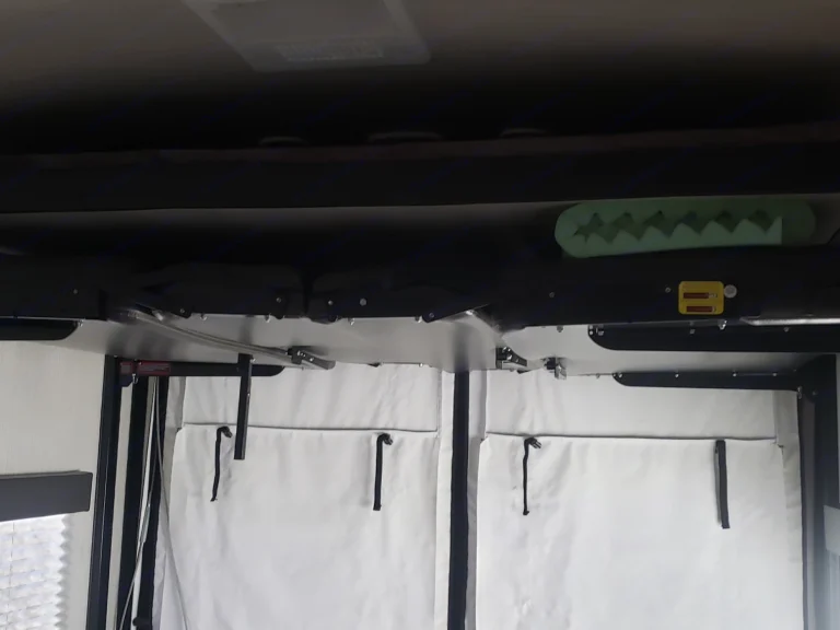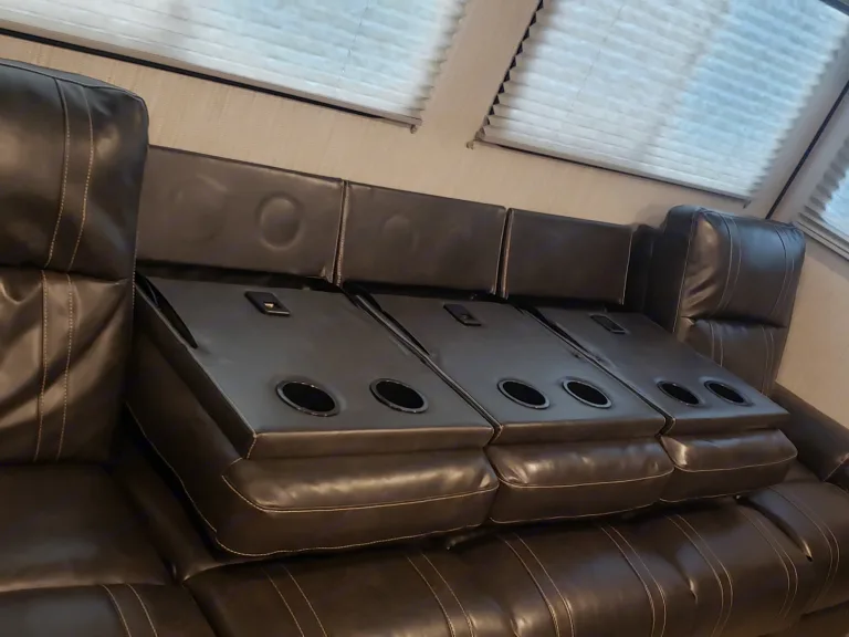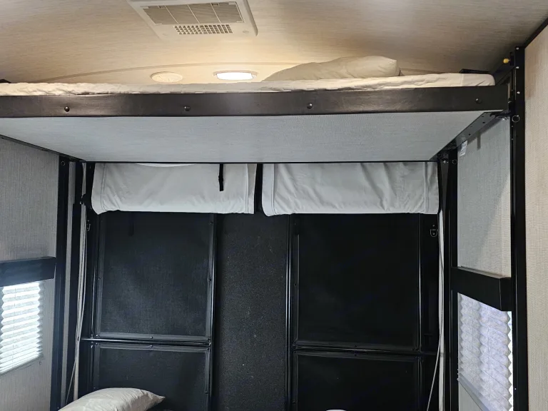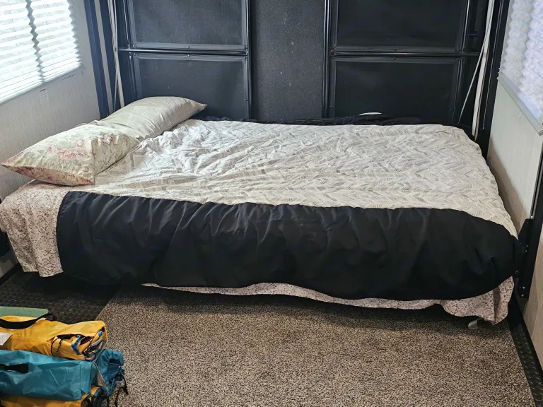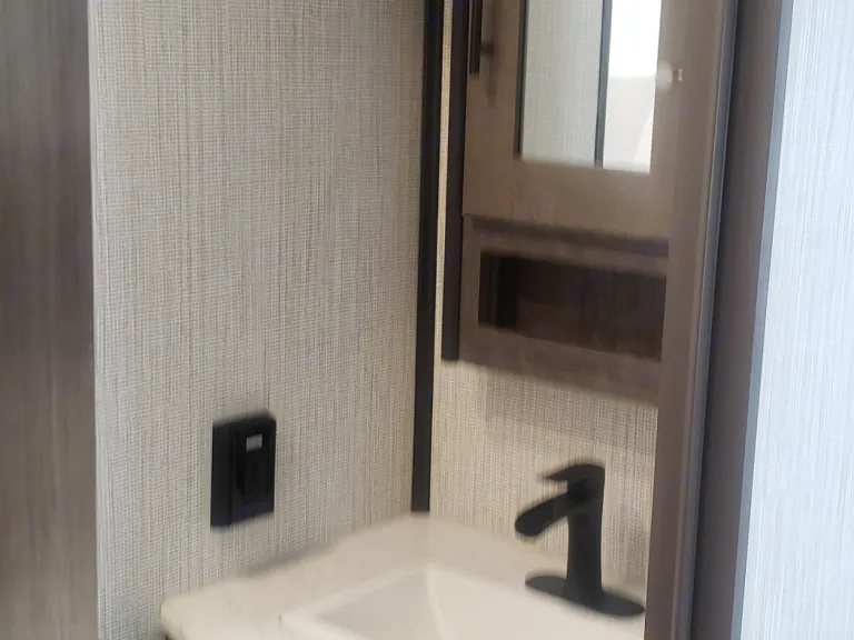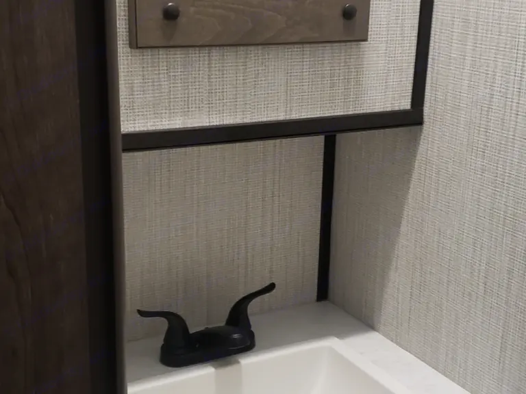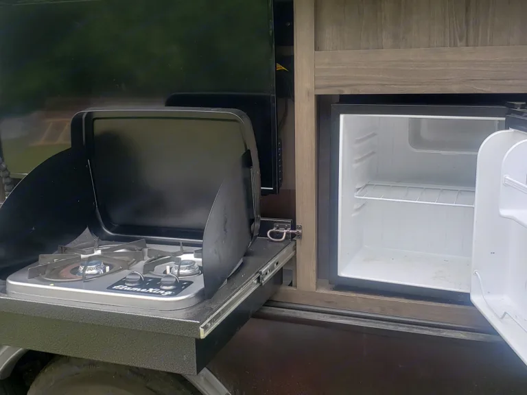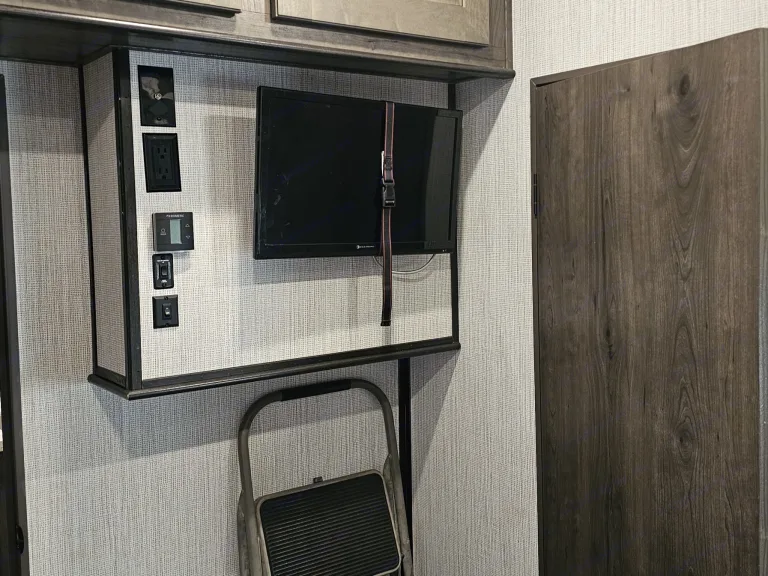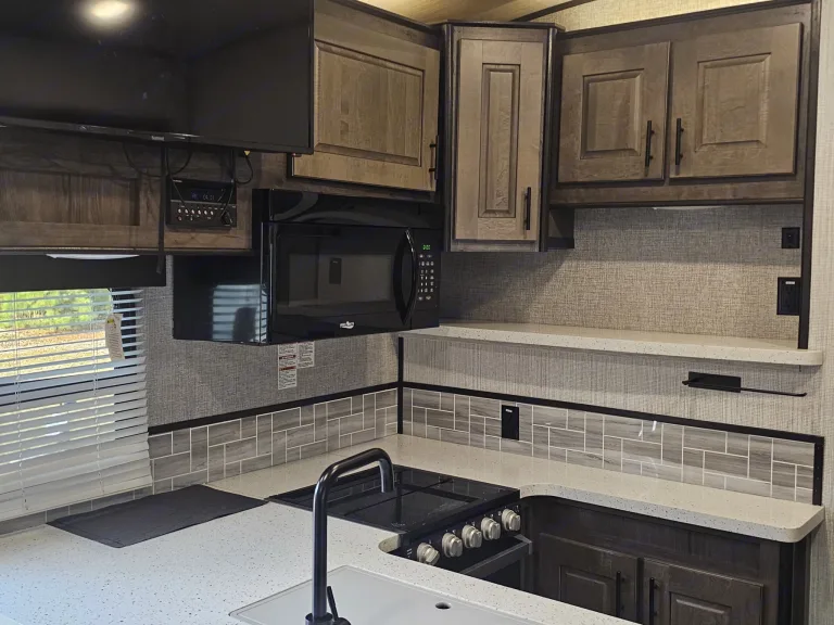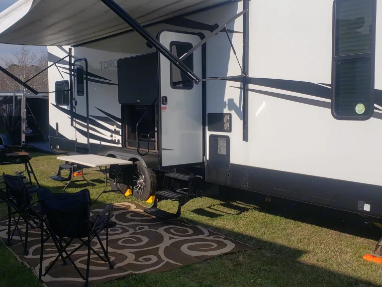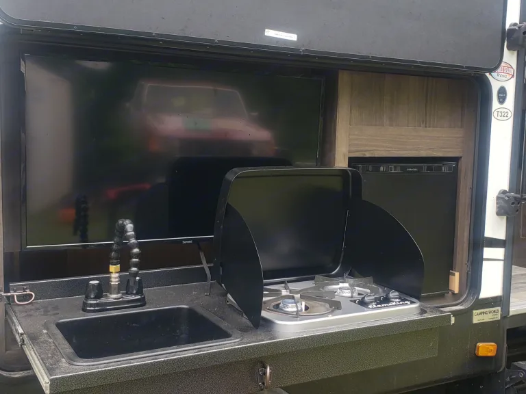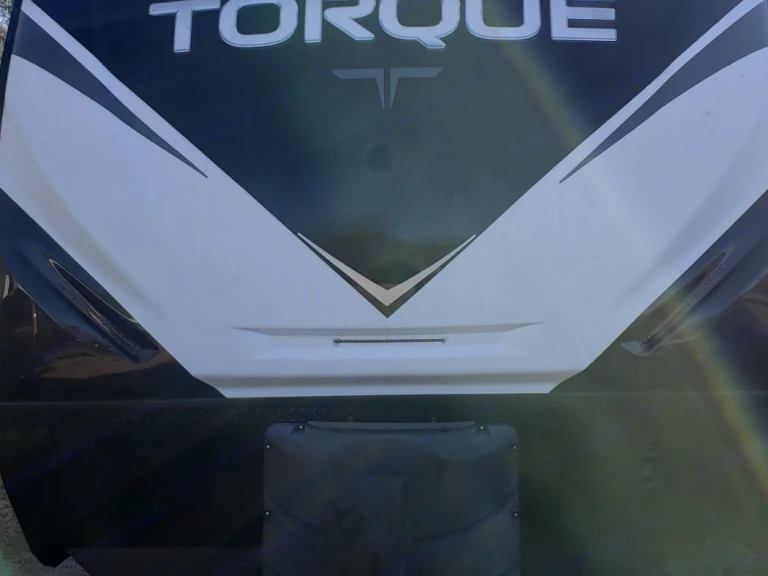 Outside, the Heartland Torque T322 boasts a rugged yet sleek exterior design. With its power awning, outdoor entertainment system, and ample storage compartments, this camper is ready to enhance your outdoor experience wherever you go. It also features an outdoor kitchen with a sink, 2 burner stove, and mini fridge. Looking to relax outside under the awning and watch your favorite movie, you can with the 40-inch TV outside. The fueling station ensures that your adventure never has to stop, allowing you to refuel your toys on the fly.