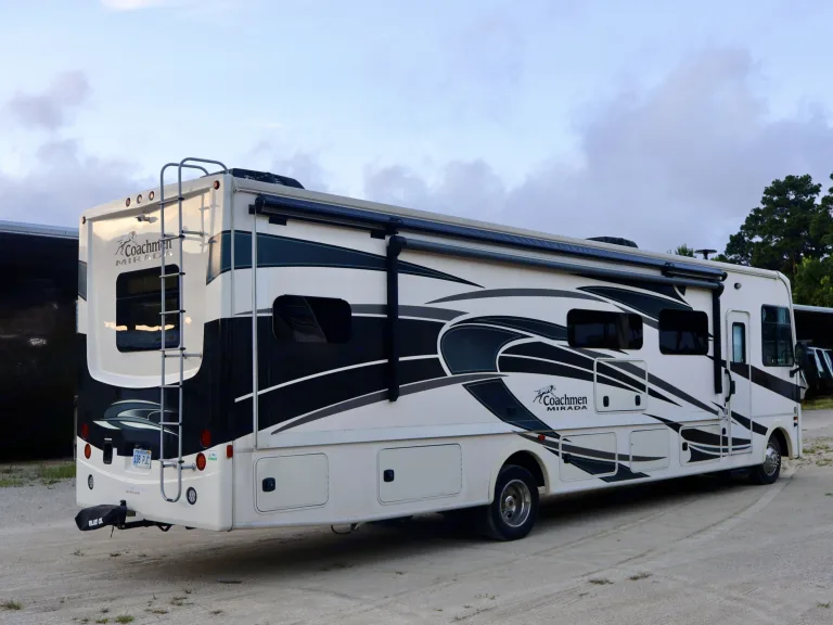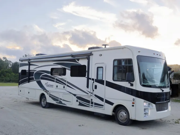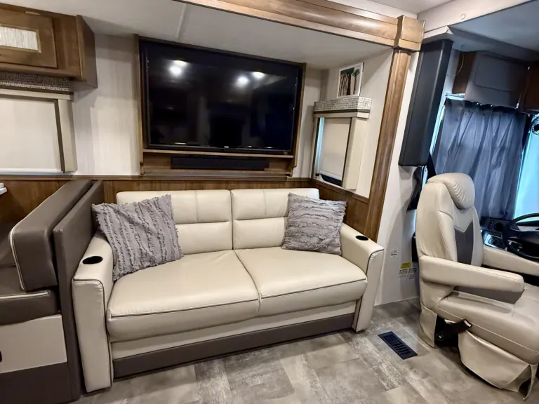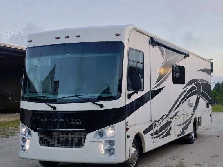 This Coachmen Mirada 350S delivers high-end residential comfort in a gas-powered Class A motorhome. This coach features a full-wall slide, bedroom slide, king bed, pull out couch, convertible dinette bed, and a residential fridge. With a tankless water heater, hydraulic leveling, and a 5.5kW Onan generator, it’s built for long-term travel or weekend escapes. Clean inside and out — fully equipped and ready to roll.