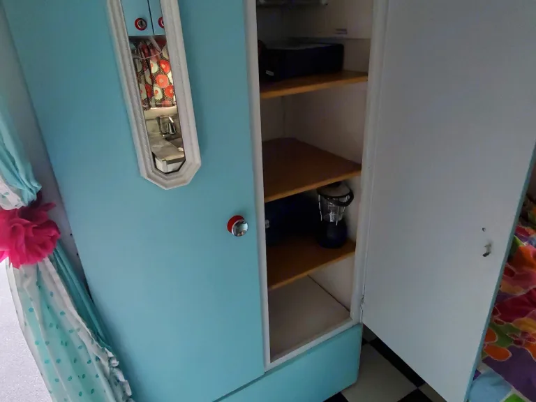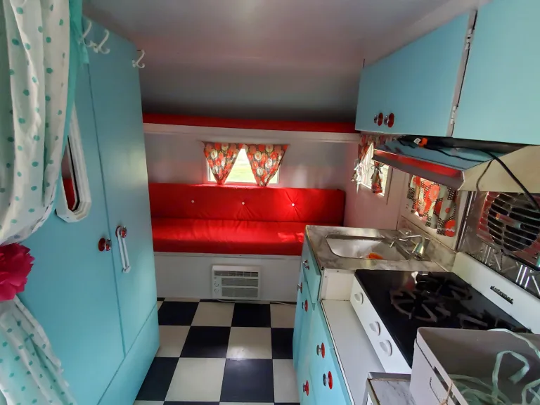 Escape today in this vintage beauty of a yesteryear. Cozy, spacious, lots of storage, easy handling. Beautiful red and white striped awning can be set up for a welcoming outdoor patio set up. Back rack is ready to hold your adventure gear and chairs so you're ready to explore by day and unwind with family and friends in the great outdoors. Step away from your day-to-day and mix up your getaway routine-we hope you have a blast!What's included• Kitchen knives, cutting board, drink coozies, (4) lunch plates, (4) ceramic bowls, (4) glass mugs