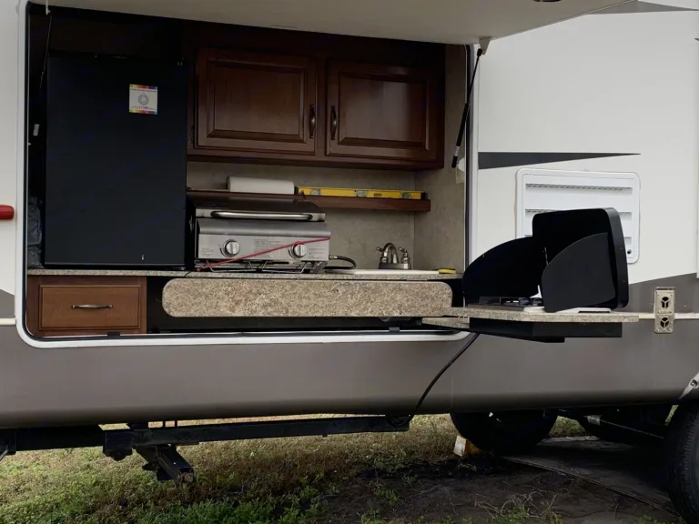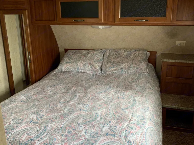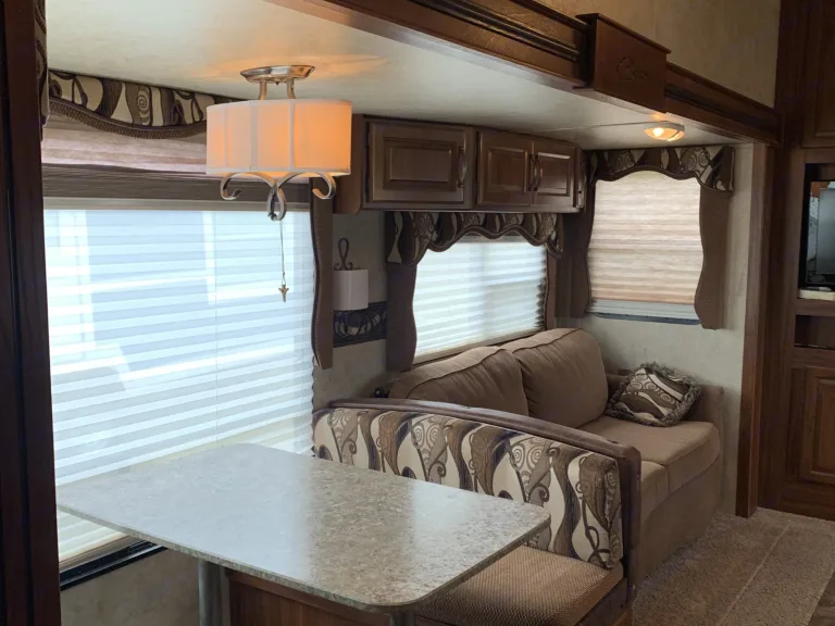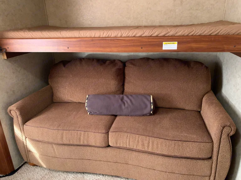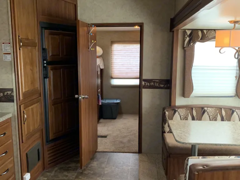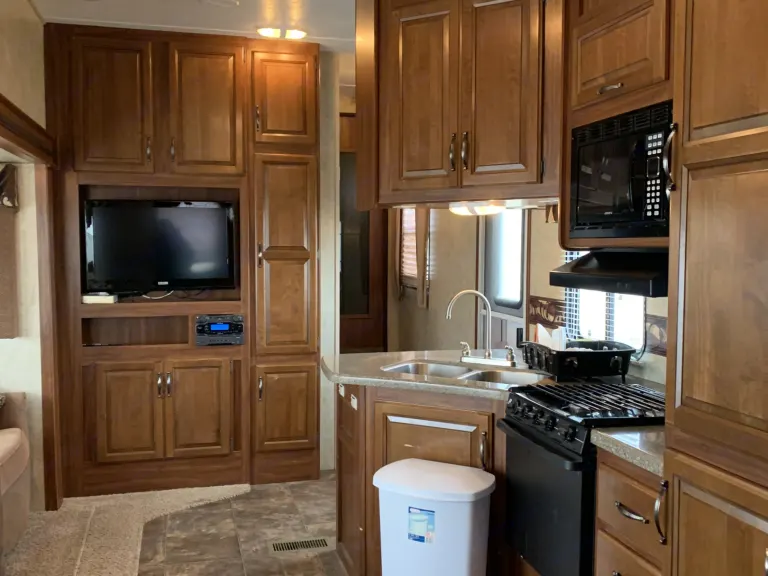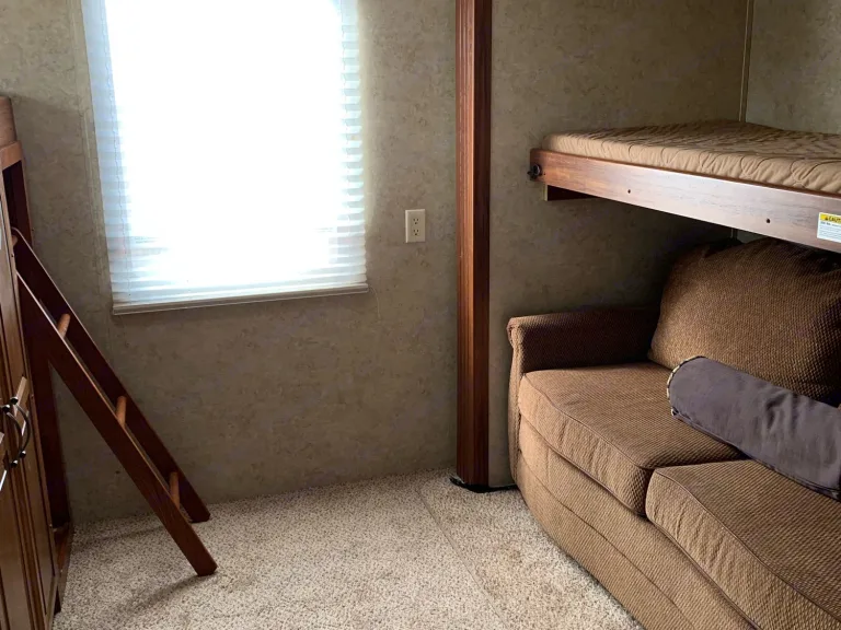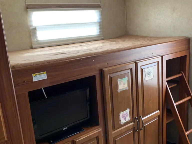 This family and pet-friendly 5th wheel camper is a great home away from home and for ***delivery only***. With a private master bedroom in the upper portion of the camper adjacent to the bathroom, a recessed living room/kitchen with pull-out bed and a convertible kitchen table for small children for extra sleeping space. In addition, there is a bunk room in the back that sleeps 4 comfortably. Outside is an outdoor kitchen with a refrigerator, sink, and stove top. RV comes fully equipped with bedding, outdoors chairs, table, and grill, kitchen cookware, plates, cups/mugs, and utensils, and more (fully stocked for your convenience). What's includedFull lineup