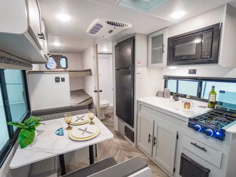 Explore the great outdoors in luxury in this modern RV! This light-weight and easy to tow camper is perfect for families who want to trek the great outdoors but still have all the comforts of home. The camper comes stocked and ready for your next camping adventure including: Smart Hdtv, plates, utensils, marshmallow sticks, toilet paper, cleaning supplies, fire poker, pie irons, weight distribution receiver with sway control (optional) and much more! Book your adventure today!-Insurance Included at no additional charge!New to camping or travel trailers? No problem! This camper can be set up easily and ready to go in no time! Upon pickup I will provide a complete and detailed educational walkthrough of the camper.Features: