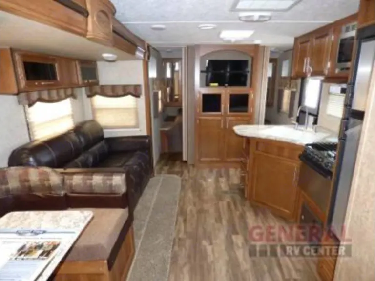 To the left of the entrance there is a double kitchen sink, three burner range, and refrigerator. On the opposite side of the trailer the slide has a u-shaped dinette and a hide-a-bed sofa. Next to the slide there is a nice size pantry for your dry goods. You are sure to enjoy watching TV or movies at the entertainment center.