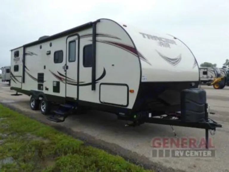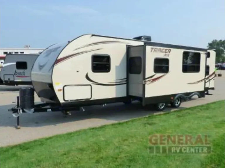 As you enter the single slide Tracer 300AIR travel trailer by Prime Time Manufacturing you will find that there is a u-dinette and a rear bunk house.