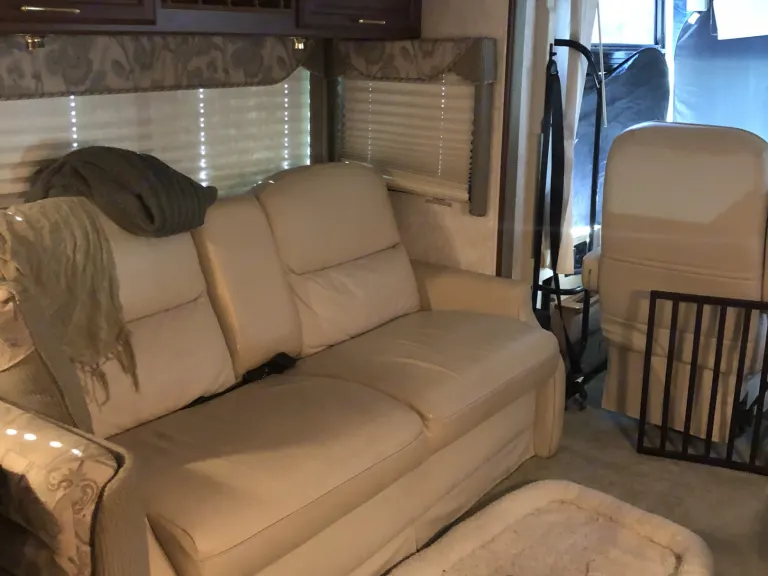 30 amp service, with ducted AC to cool whole coach evenly. Living room TV.