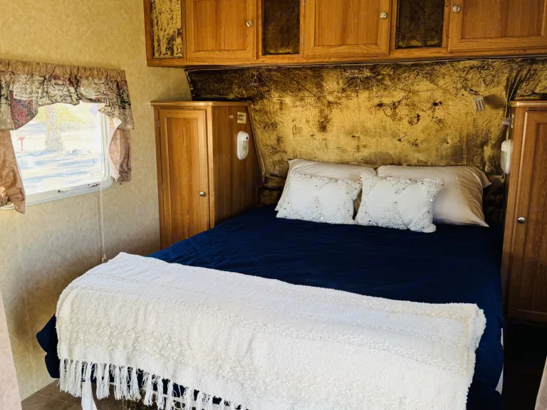 Cozy RV rental bedroom featuring a bed with navy and white bedding, wooden cabinets, and tan curtains.. R-Vision Trail-Lite Trail-Sport 2006