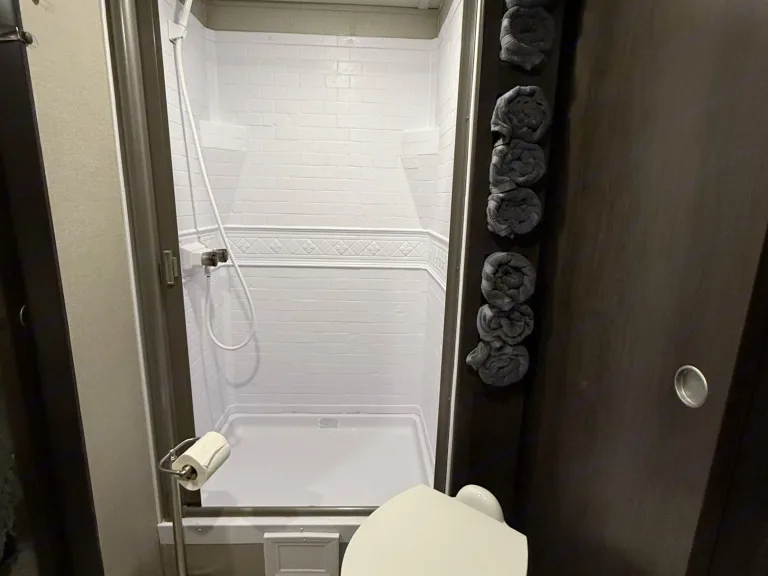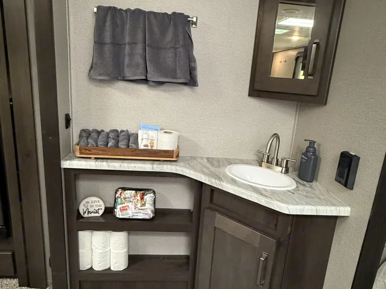 Private master bedroom with brand new queen size mattress and luxury mattress topper, plenty of storage in bedside cabinets, overhead storage and storage under the bed to store all your clothes and personal belongings. Bathroom is located off of main bedroom and off of living area. We provide Towels, washcloths, a hair dryer, a small supply of toiletries and RV toilet paper (Regular Toilet Paper Cannot BE Used, IT Will Damage THE Septic System)