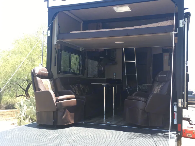 Newer toy hauler, solar, on board generator, porch kit for tailgate ramp with screen door. 18’ toy hauler for lighter pulling and accessibility.
