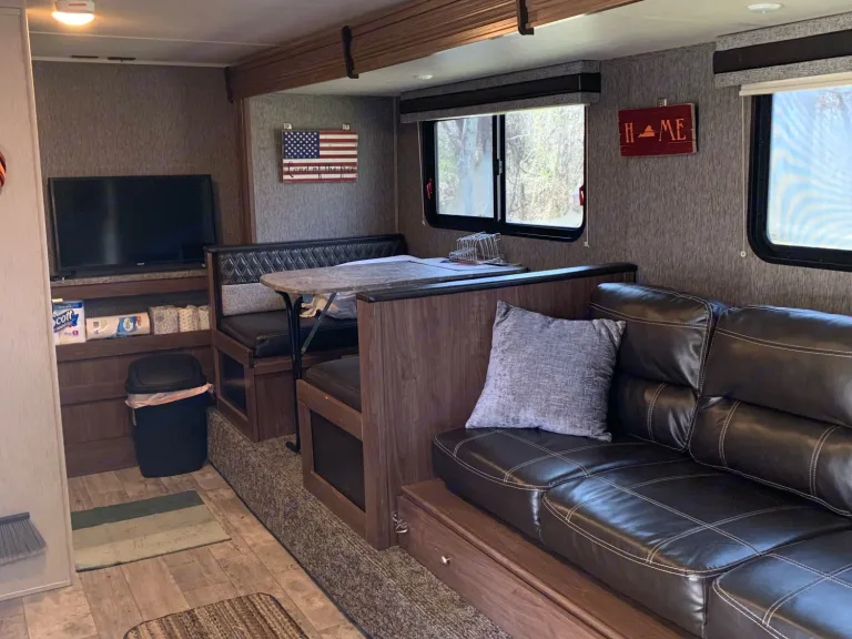 Our 2018 Heartland Pioneer is lightweight and easy to tow with an SUV or truck. It sleeps 4 people comfortably but can sleep up to 6 people. The dinette converts into a full size bed and the couch pulls out. There is also a slide out under the couch that can accommodate an air mattress.Comes fully equipped with: