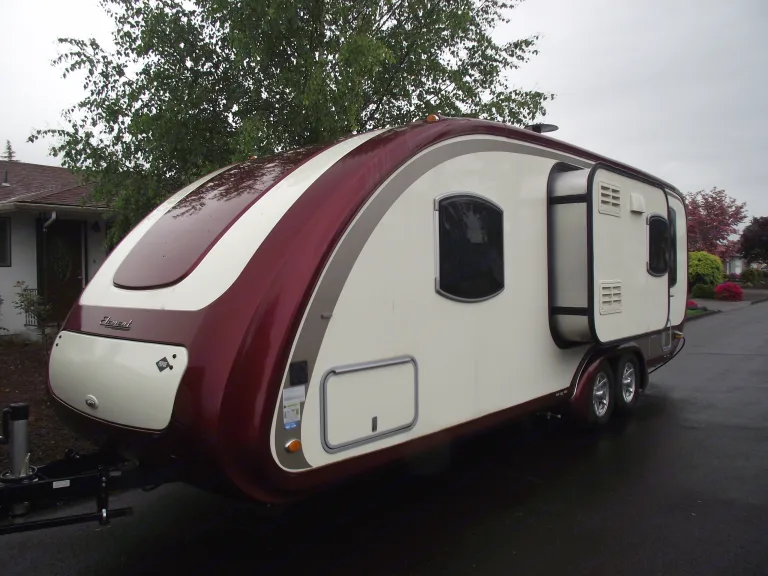 Now you can rent the most beautiful trailer in the campground: the streamlined 2012 Evergreen Element ET26 SRL. Inside you find a very modern floor plan with lots of cabinet space throughout. In the master bedroom you find a 60" by 80" walk-around queen bed with under-bed storage and lots of light from the two large windows. The kitchen slide out has a covered 2 burner range with vent hood, a covered stainless steel sink, and a microwave. The 5 cu ft refrigerator operates on propane, AC, or 12 VDC. The bath has a large shower, toilet, and sink. The bench in the living area makes into a child-size bed, but this trailer is really intended for two. You will be comfortable in any weather using either the ducted propane furnace or the ceiling-mount A/C. You can watch the flat-screen TV or play a DVD, listen to the stereo, or spend your time outdoors. Outside, there is a fully self-supported 14' awning and an outdoor shower. At the front, inside the aerodynamic cap, are the batteries and propane tanks. It also has a large, lighted pass-through storage compartment. At 26’ long (28’ hitch-to-license plate) and 7’ 6” wide, this great trailer is big enough to be comfortable, yet small enough to fit readily into almost any camp site. We include all necessary kitchen, dining, and cleaning supplies. Bring your own bedroom and bathroom items.
