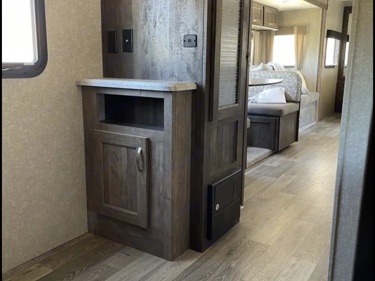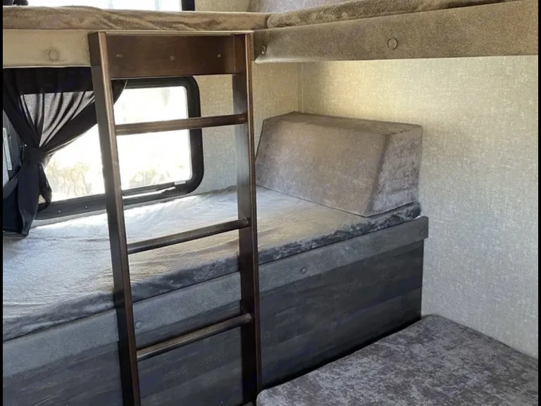 The RV has 2 bedrooms. One has queen size bed and a walk around bed and two wardrobes with built-in cabinets over the bed. One more room is on the other side of the RV and it has bunk beds.
