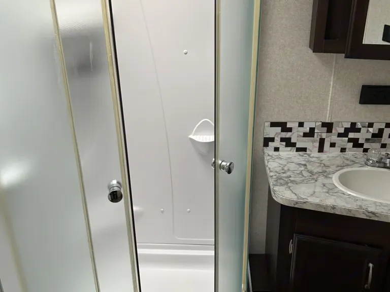 Jack Knife Couch. Bathroom With Corner Shower. TWO AC Units. Outside Kitchen, Outside Shower.