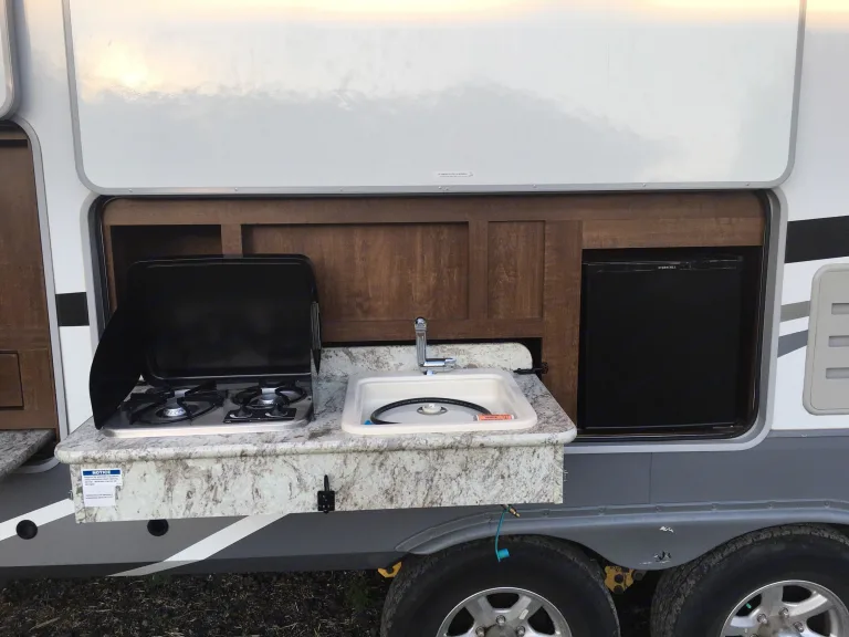Very nice trailer, has 2 slide outs for a very open spacious camping experience. Super clean like new trailer. Nice queen size bed in master bedroom, pull out bed in living room. Comes stocked with plates, cups, silverware, bath towels, some bedding. Has indoor and outdoor shower. We have generator available for extra $10 per night.