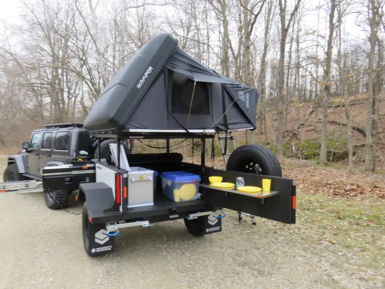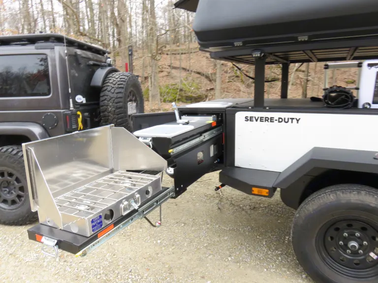 A couple things that’ll make life easier. Always set your stabilizing jacks before opening the tent. The galley can be opened when hitched, or unhitched. Remember to roll back the top cover before opening the tailgate. Always pin, chain and plug when hooking up to your tow vehicle - pin the hitch in the receiver, chain the trailer to the receiver, hook up the emergency brakes, and plug the electrics in place then check lights!