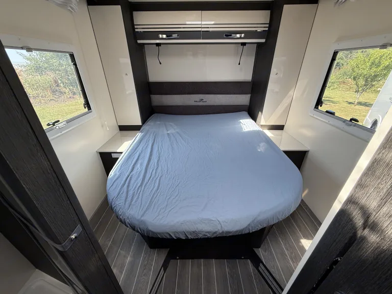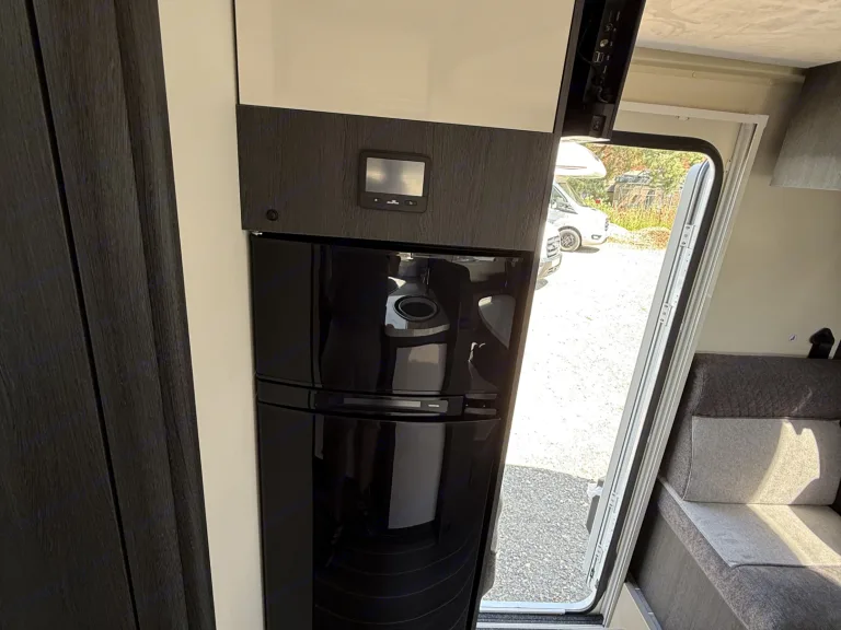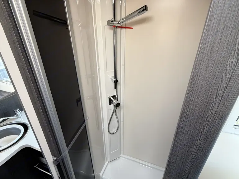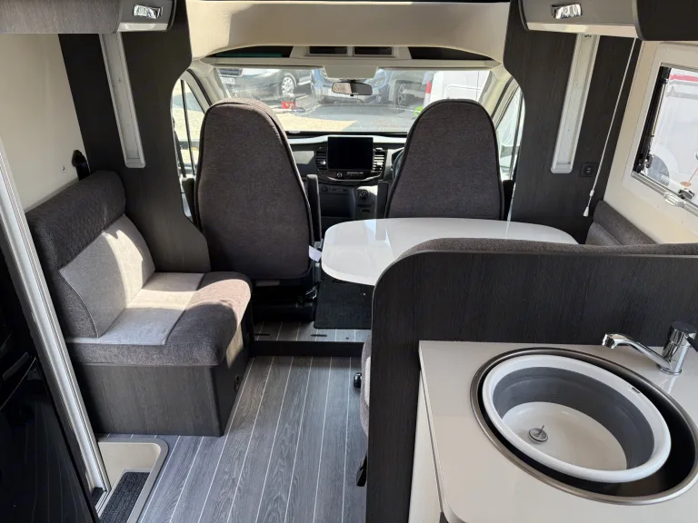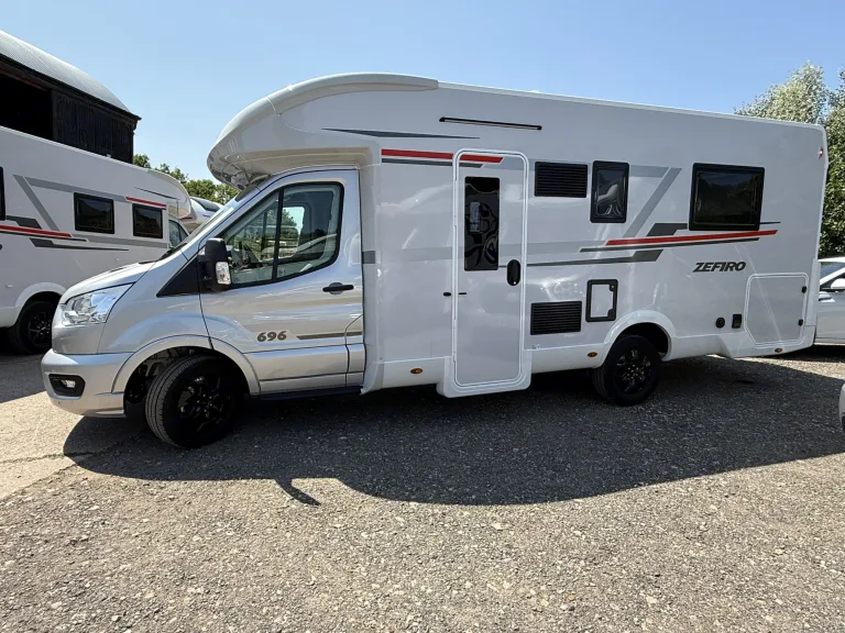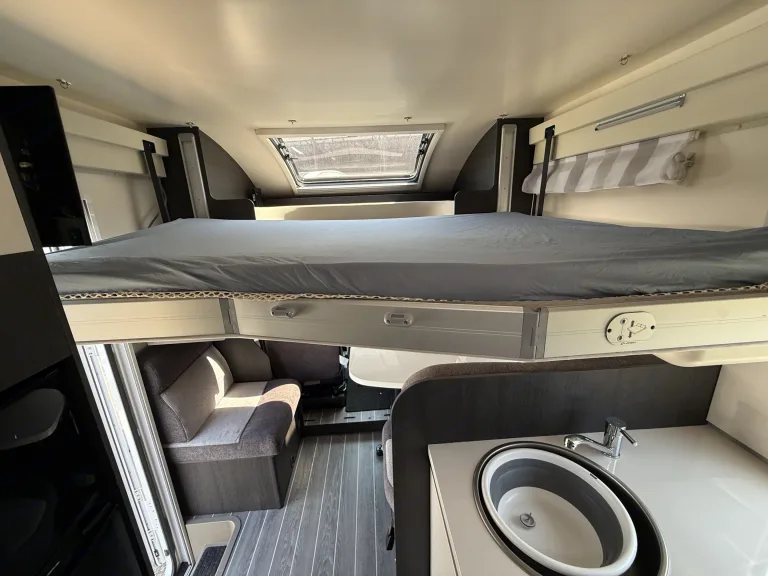 A rear island bed with underbed storage, bedside tables and two wardrobes all closed off by a door give a level of privacy and peacefulness normally only ever dreamed of when away in a hotel. Just in front of this you’ll discover the domestic style shower cubicle separate from the remainder of the bathroom. The popular L-shaped lounge area, creates seating for up to five people during the day, offering a homely space for relaxing and entertaining. Come night-time, a second double bed from the delicate body curves of the Zefiro 696 lowers down above the lounge using a smooth, electric mechanism.