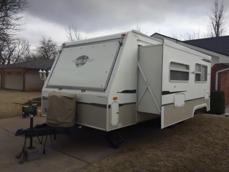 Just the right size for a small family or a couple. This camper is tidy and comfortable. It has a full-sized fold out bed on each end plus sleeping on the sofa conversion and dinette conversion. This is an expandable, not a pop-up. There's a flat screen TV/DVD in the back sleeping area. Requires brake controller. Dry weight is 3,837 lb. Hitch weight is ~574 lb.