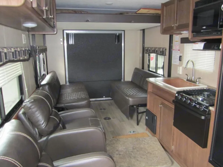 Brand new 30' Toy Hauler that has room to sleep up to 6. 2 comfortable leather chairs and fold down seats give plenty of room when socializing inside. 1 flat screen tv in the bedroom and 1 flat screen tv in the living area. There is also a built in stereo system that has speakers inside and out so you can enjoy music while enjoying a camp fire outside under the canopy. You must have a break controller installed on your towing vehicle either after market or with your dealer installed tow package. Florida law requires break control on any towed item that weighs more than 3,000 lbs. This camper is 5,500+ before any cargo.