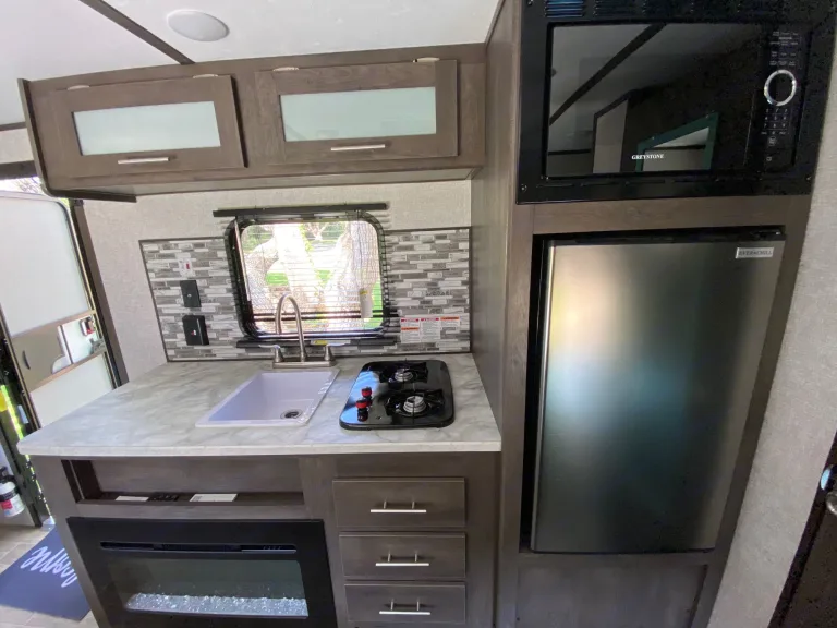 And it has a Fireplace!This Brand NEW 2020 bunk house camper weighs 3042 lbs dry and sleeps five comfortably. There is a queen bed for two, a dinette that turns into a bed, as well as a double bunk in the rear.This camper is small but mighty- not only is there storage for kitchen and bathroom supplies, but also large storage under the queen bed and one of the bunk. Queen bed storage and storage accessible from outside the unit as well! Easy access for the whole family. Has a full bath with shower and toilet.